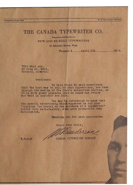 Located in the heart of Toronto’s business district at 45 Adelaide Street East, it was moved in the 1930s to a nearby building on Victoria Street and in the 1950s, relocated by a son of J.C. Sanderson to 100 Adelaide Street East. In the years that followed the company became a sales leader for manufacturers such as Olympia, Olivetti, Remington, Smith Corona, Sharp, and IBM. It received national awards and accreditations as one of Toronto’s best-known business equipment stores.
